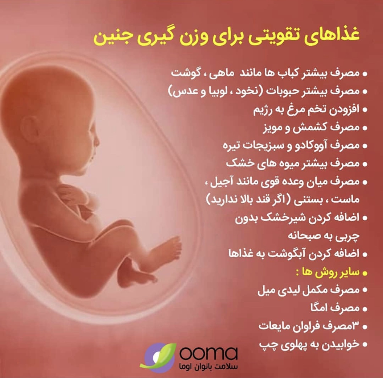 اصلا بفکر تپل شدن جنین نباش،چیزی بخور که بدنشو و استخوناشو قوی کنه و رنگ پوستش شفاف باشه. من دخترمو هرکی روز زایمان میدید دهنش باز میموند پوستش مثه شیشه شفافو سفید بود .بسکه سرش پسته و اناناس و موز خوردم. ماه اخرم روزی یه بطری شیر و بادوم میخوردم.