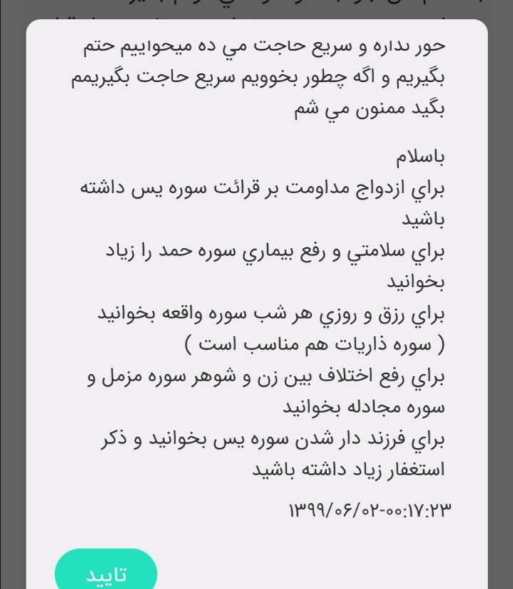 عزيزم ختم تموم شد؟ من اومدم لايك كنم كه خوندم ديدم دوستان ميكن تموم شده. خدا رو شكر منم بودم توي ختم ...