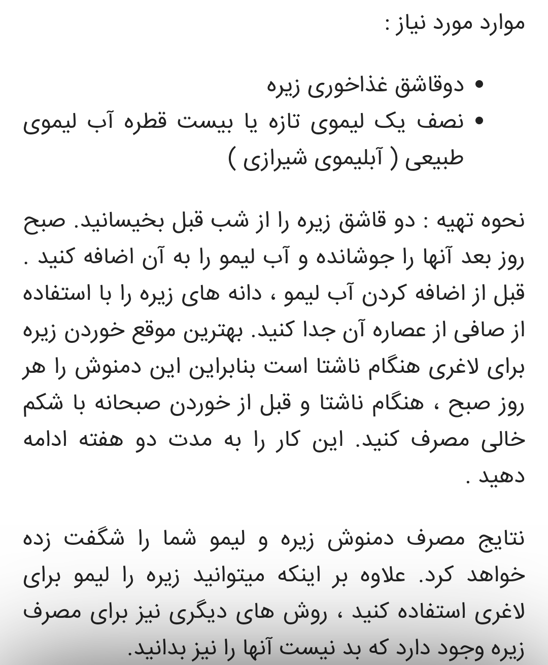 اینو میگم انجام بده مطمئن باش نتیجه بگیری  زیره سبز بخر شب جوش بده صاف کن با آبلیمو قاطی کن نا ...