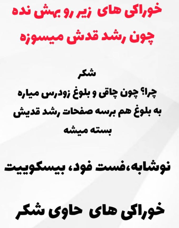 نوشابه ، فست فود، بیسکوییت و شکر هم توصیه میشه که خورده نشه، یکی از نکاتی که دکتر توکلی بعد از گرفتن حداقل صدهزارتومن میگفت این بود که غذاهای هر وعده باید تازه طبخ بشه و غذای مونده از وعده غذایی قبل خورده نشه!