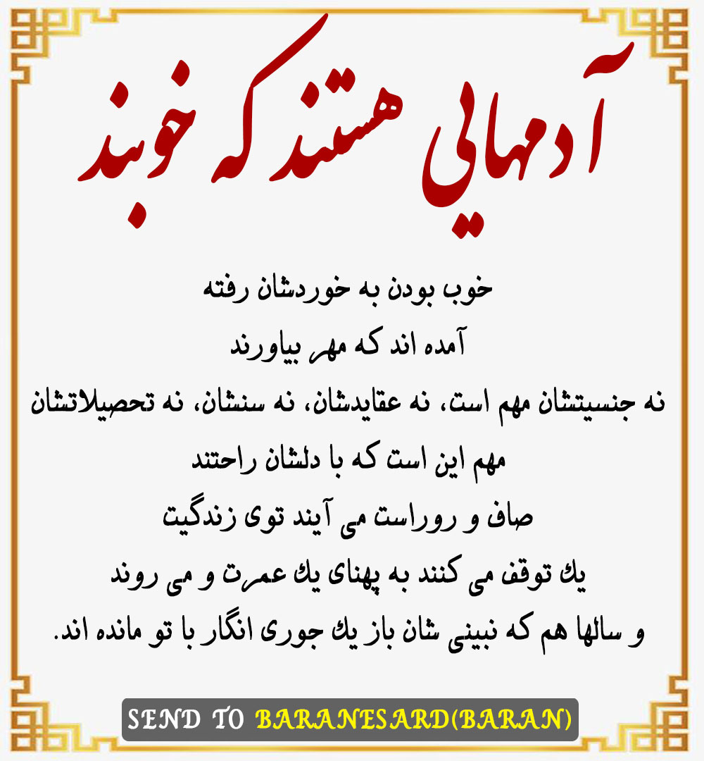 ✔️اولین روز بارانی را به خاطر داری؟ غافلگیر شدیم ...چتر نداشتیم خندیدیم دویدیم وبه شالاپ شلوپ های گل آلود عشق ورزیدیم.دومین روز بارانی چطور؟پیش بینی اش را کرده بودی چتر آورده بودی و من غافلگیر شدم سعی می کردی من خیس نشوم و شانه سمت چپ تو کاملا خیس بود.و سومین روز چطور؟گفتی سرت درد می کند و حوصله نداری سرما بخوری چتر را کامل بالای سر خودت گرفتی و شانه راست من کاملا خیس شد.وچند روز پیش را چطور؟به خاطر داری؟که با یک چتر اضافه آمدی و مجبور بودیم برای اینکه پین های چتر توی چش و چالمان نرود دو قدم از هم دورتر راه برویم...فردا دیگر برای قدم زدن نمی آیم تنها برو..دکتر علی شریعتی                 خاک باش! علی ابوتراب است ....                                      هستم؛ به میزان معرفتم به حقیقت... و نیستم به میزان دور بودنم از آن...«‏اللهم أرح قلبه فهو وقلبه في قلبي.»   محبوب من!من با شما حرف‌هایی دارم که با کلمات نمی‌شود گفت؛درمانش،دیدار است... 💔! -#بےݩواےحسیݩ              درباره‌ی من: هیچم در این وادی حیران محل سکونت: شهر عمه‌ی سادات( عمه‌معصومه‌سلام‌الله علیها:)))) علایق: نوشتن برای خودِ مخدوشم، غرق‌شدن در اعماق کتابی ژرف؛ اگر قرآن و نهج‌البلاغه و کتب فلسفی باشد نیکو‌تر است! به خدا و رسول و اهل بیت و نائب خلیفه‌اش بر زمین نیز علاقه‌ی فراوانی دارم. موسیقی مورد علاقه: هر سازی که احساسات خوبم را به غلیان آورد ...در گوش برگ‌های افتاده می‌خواند؛ نگاهم را از شما بر نمی‌دارم. که اکنون،زینت زمین شده‌اید.خدای مهربان افتاده‌ها! می‌شود من هم با برگ‌ها، بیفتم به پایتان؟ برگرفته از آیه‌ی ۵۹ سوره‌ی انعام      گفت: اگر بروم چه؟گفتم: آن‌گاه تو اولین وطنی هستی‌که ساکنانش را ترک می‌کند!سعید_انصاریان   لَقَدْ خَلَقْنَا الْإِنسَانَ فِي كَبَدٍ‏که ما انسان را در رنج آفریدیم..🌱سوره بلد_آیه ۴ مارا در بازارچه ی رنج می گردانند‏و هرکس را به اندازه وسع خَریدَش ‏رنج می دهند..!