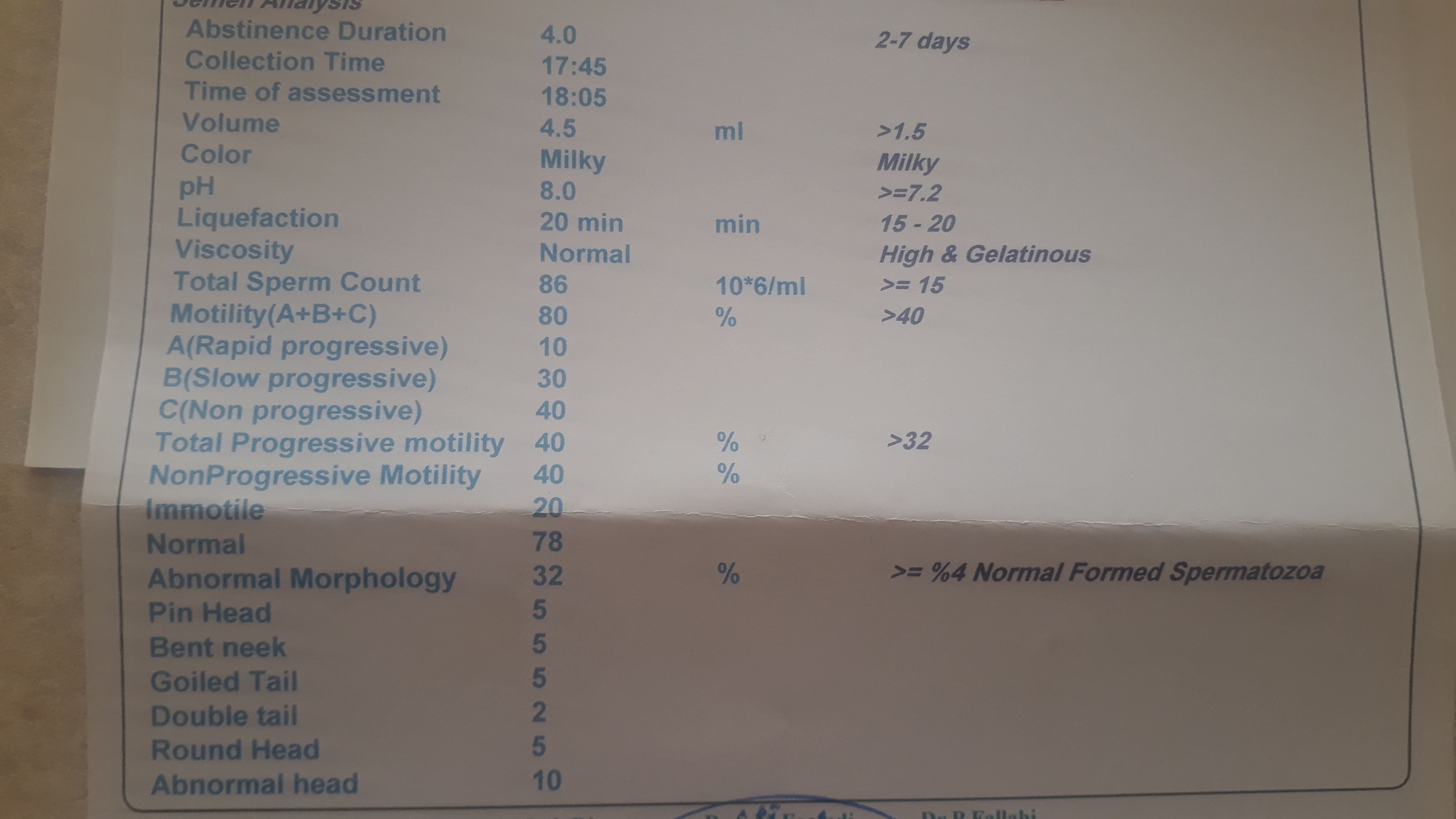 آهای خانمای خوشگل بگین این ازمایش همسرمه ۱۰ ماه هست ازدواج کردم ۱۸ سالمه باردار نشدم ازمایش شو واسم تفسیر کنید چیزی کمی داره یا ضعیف داره😭😭😭😭😭😭😭به هر کی میگم میگه بفرس دیگ ج نمیده😢