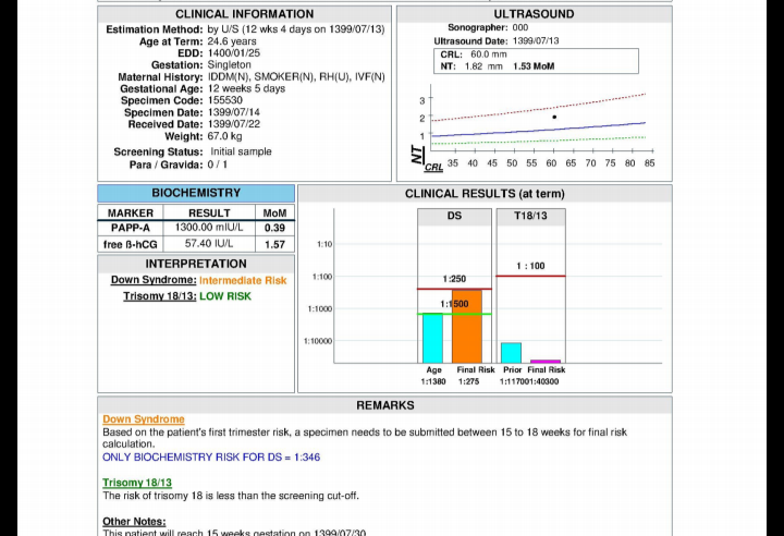 هیچی نیست نترس. منم اینجوری بود بچه ام سالمه الان 16ماه. نگران نباش. غربالگری دوم دادی نمودارت سبزشد جای نگرانی نیست. عدد ان تی عالیه. من صبرکردم غربالگری دوم دادم خوب بود.