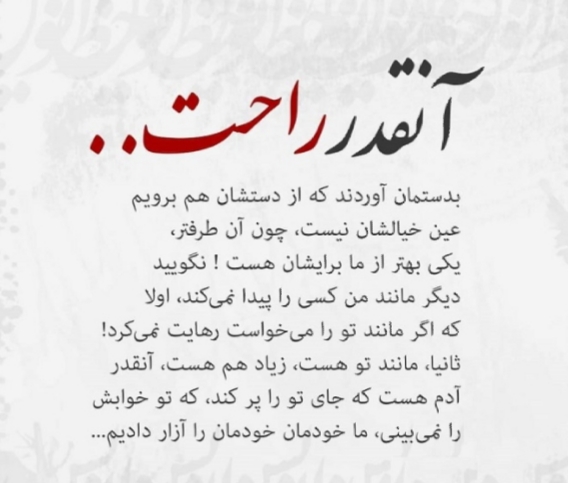 یکی از بدترین چیزایی که میتونی تجربه کنی اینه که از کسی ضربه بخوری که سختی های زندگیتو براش توضیح دادی بدونه چقد از درون شکستی و آسیب پذیری و دقیقا همون کاریو انجام بده که میگفت هیچوقت انجام نمیده واقعا چرا دقیقا زخمو نشونش بدی همونجا رو دوباره پاره کنه و نمک بریزه اونقدر دلم ازت شکست که فکر نکنم دیگه دلم باهات صاف بشه تو اصلا مسلمون هستی که قسم آقام ابوالفضل العباس خوردم که من جز موقعی که فقط خودت خواستی با کسی حرفی نزدم ولی بازم داری تهمت میزنی خجالت تو باید بکشی که قسم باب الحوائج که بزرگترین مقدسات هست برات خوردم باور نکردی خیلی ازش بترس همین  دیگه هم مهم نیست من همیشه پیش خودم و خدای خودم سر افرازم که تو این رفاقت کم نزاشتم ولی تو اخرین نامردیتو هم نشونم دادی و رفتی خوب شد این روزها رو هم با چشمام دیدم کسی که تک تک دردامو میدونست همون دردا رو دوباره بهم داد  نه من قلبم تیره تار نیست این آدما بودن که منو به این حال و روز انداختن ولی توخیلی از بالا به آدما نگاه میکنی اینقدر غرور و تکبر خوب نیست چون که بالاخره عاقبت هممون یه جاست بی رحم تر از تو ندیدم اون حرفایی که بهم زدی تا مغز استخونمو سوزنوندی به کنار و اون دردل هایی که به عنوان یه خواهر هم باهات میکردم و با تک تکشون بهم زخم زبون زدی  اونم به کنار ولی کسی که به خواهرش تهمت بزنه اشکشو در بیاره هیچ وقت خواهرش نبوده فقط می تونه دشمنش باشه  بترس از روزی که خدا صدای شکسته های دلمو بشنوه  سر پل صراط اگه اون تهمتهایی که بهم زدی رو ثابت کردی که هیچ ولی اگه نکردی سر همون پل ازت نمیگذرم و حلالت نمیکنم فکر کردی می بخشمت بخاطر این زخم عمیقی که به قلبم زدی و رفتی خدایا دیدی ادمهایی که از جفت چشمام بیشتر بهشون اعتماد داشتم با دلم چیکار کردند و رفتند خدایا اشکامو دیدی خدایا صدای شکستن دلمو از سر تهمت نا حق شنیدی که جز تو شاهدی نداشتم خدایا ببین شاهد همشون باش شاهد باش کسی که بهش میگفتم خواهر چجوری در حقم خواهری تموم کرد و رفت من که سکوت کردم و رفتم ولی بدون دنیا همیشه اینجوری نمیمونه به همین غروب جمعه قسم به همین اشکهای دل شکستم قسم هیچوقت نمیبخشمتون