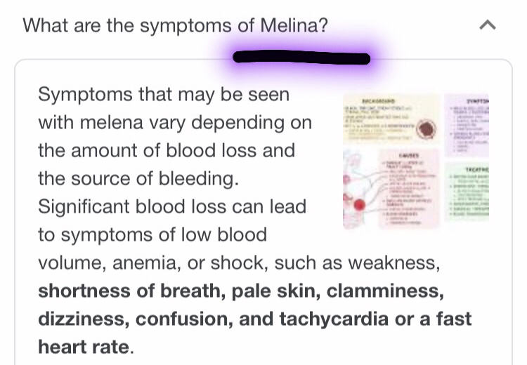 ملينا خيلي شبيه ملنا كه مدفوع خونى و مشكل زخم رودس melina melena جديدا اگه سرچ كنيد ميبينيد ملينا همون ملنا مياره و تو امريكا و كانادا اصلا گذاشته نميشه و اگر بگيد ملينا فقط تصوير بوى بد خون در مدفوع مياد تو ذهنشون تجربشو داشتم كه ميگم