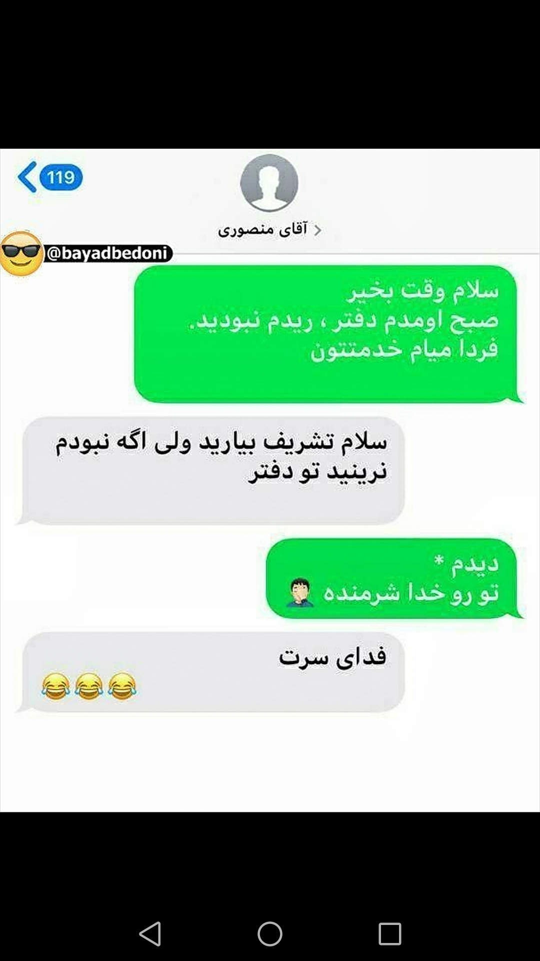 _پیشی_ عضویت: 1400/02/05 تعداد پست: 588 😂😂😂😑 برای خوشحالی و ظهور آقا امام زمان میشه یک صلوات بفرستید💚اَللّهُمَّ عَجِّل لِوَلیِّکَ الفَرَج🌱