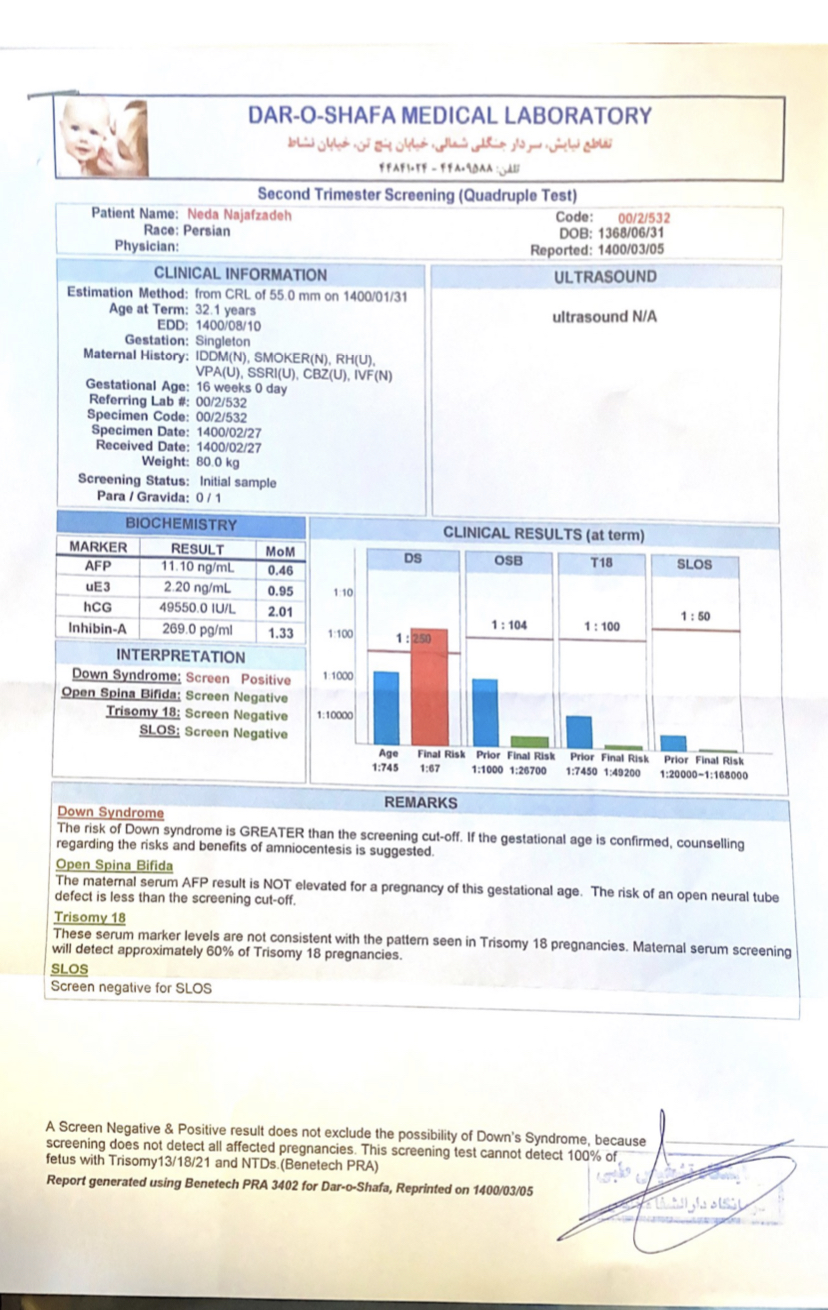 من خودم ان تیم دو و خورده ای بود آمینوشدم گفتن سندرم نیست سونو سه بعدی دادم اعضا بدنش سالم بود اکوی قلب هم دادم سالم بود ولی وقتی دنیا اومد بعد یک سال و نیم فهمیدم غدد فوق کلیوی اش مشکل داره نمیتونه یه هورمونی رو بسازه و درقالب قرص دارم بهش میدم هعععییی
