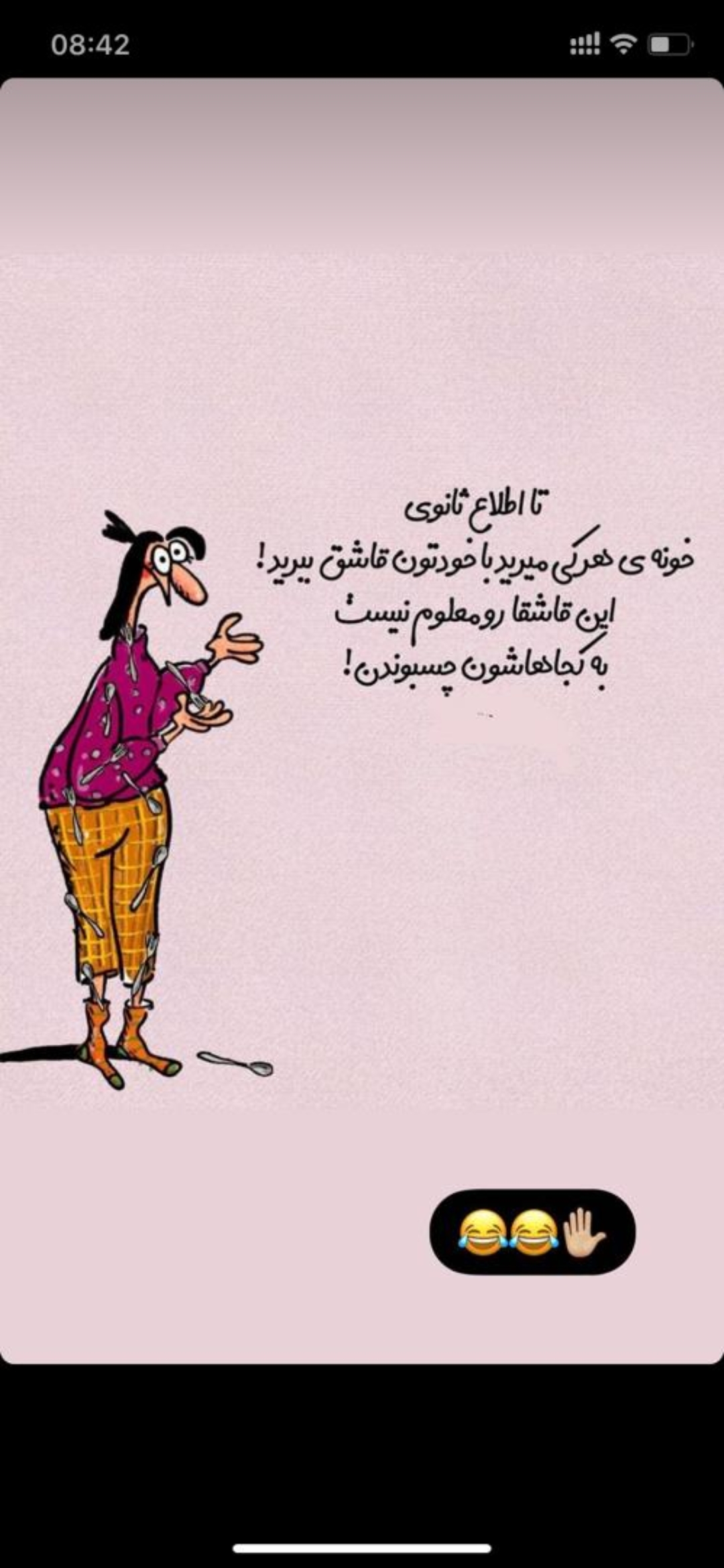 وارﺩ ﺩﺍﺭﻭﺧﺎﻧﻪ ﺷﺪﻡ ﻭ ﻣﻨﺘﻈﺮ ﺑﻮﺩﻡ ﺗﺎ ﻧﺴﺨﻪ‌ﺍﻡ ﺭﺍ ﺗﺤﻮﯾﻞ ﺩﻫﻨﺪ👀.ﻓﺮﺩﯼ ﻭﺍﺭﺩ ﺷﺪ ﻭ ﺑﺎ ﻟﻬﺠﻪ‌ﺍﯼ ﺳﺎﺩﻩ ﻭ ﺭﻭﺳﺘﺎﯾﯽ ﭘﺮﺳﯿﺪ:ﮐﺮﻡ ﺿﺪ ﺳﯿﻤﺎﻥ ﺩﺍﺭﯾﻦ؟ ﻓﺮﻭﺷﻨﺪﻩ ﺑﺎ ﻟﺤﻨﯽ ﺗﻤﺴﺨﺮ ﺁﻣﯿﺰ ﭘﺮﺳﯿﺪ:😏ﮐﺮﻡ ﺿﺪ ﺳﯿﻤﺎﻥ؟ ﺑﻠﻪ ﮐﻪ ﺩﺍﺭﯾﻢ.ﮐﺮﻡ ﺿﺪ ﺗﯿﺮ ﺁﻫﻦ ﻭ ﺁﺟﺮ ﻫﻢ ﺩﺍﺭﻡ ﺣﺎﻻ ﺍﯾﺮﺍﻧﯿﺸﻮ ﻣﯿﺨﻮﺍﯼ ﯾﺎ ﺧﺎﺭﺟﯽ؟ﺍﻣﺎ ﮔﻔﺘﻪ ﺑﺎﺷﻢ ﺧﺎﺭﺟﯿﺶ ﮔﺮﻭﻧﻪ ﻫﺎ. ﻣﺮﺩ ﻧﮕﺎﻫﺶ ﺭﺍ ﺑﻪ ﺩﺳﺘﺎﻧﺶ ﺩﻭﺧﺖ ﻭ ﺁﻧ‌ﻬﺎ ﺭﺍ ﺭﻭ ﺑﻪ ﺻﻮﺭﺕ ﻓﺮﻭﺷﻨﺪﻩ ﮔﺮﻓﺖ ﻭ ﮔﻔﺖ:ﺍﺯ ﻭﻗﺘﯽ ﮐﺎﺭﮔﺮ ﺳﺎﺧﺘﻤﻮﻥ ﺷﺪﻡ ﺩﺳﺘﺎﻡ ﺯﺑﺮ ﺷﺪﻩ، ﻧﻤﯽ‌ﺗﻮﻧﻢ ﺻﻮﺭﺕ ﺩﺧﺘﺮﻣﻮ ﻧﺎﺯ ﮐﻨﻢ🤗…ﺍﮔﻪ ﺧﺎﺭﺟﯿﺶ ﺑﻬﺘﺮﻩ، ﺧﺎﺭﺟﯽ ﺑﺪﻩ.ﻣﺘﺼﺪﯼ ﺩﺍﺭﻭﺧﺎﻧﻪ ﻟﺒﺨﻨﺪ ﺭﻭﯼ ﻟﺒﺎنش ﯾﺦ ﺯﺩ🙃…ﭼﻪ ﺣﻘﯿﺮ ﻭ ﻛﻮﭼﮏ ﺍﺳﺖ ﺁﻥ ﮐﺴﯽ ﻛﻪ ﺑــﻪ ﺧﻮﺩ ﻣﻐـ🚶🏻‍♀️ـﺮﻭﺭ ﺍﺳﺖ!ﭼﺮﺍ ﻛﻪ ﻧﻤﯽ‌ﺩﺍﻧﺪ ﺑﻌﺪ ﺍﺯ ﺑﺎﺯﯼ ﺷﻄﺮﻧﺞ، ﺷﺎﻩ ﻭ ﺳـﺮﺑﺎﺯ ﻫـﻤﻪ ﺩﺭ ﯾﮏ ﺟﻌﺒﻪ ﻗﺮﺍﺭ ﻣﯽ‌ﮔﯿﺮﻧﺪ.😉 جایگاه شاه و گدا، دارا و ندار قبر اسـت…👩‍🦯تقواست کـه سرنوشت ساز اسـت💌 برای رسیدن بـه “کبریا” باید نه کبر داشت نه ریا💔💔