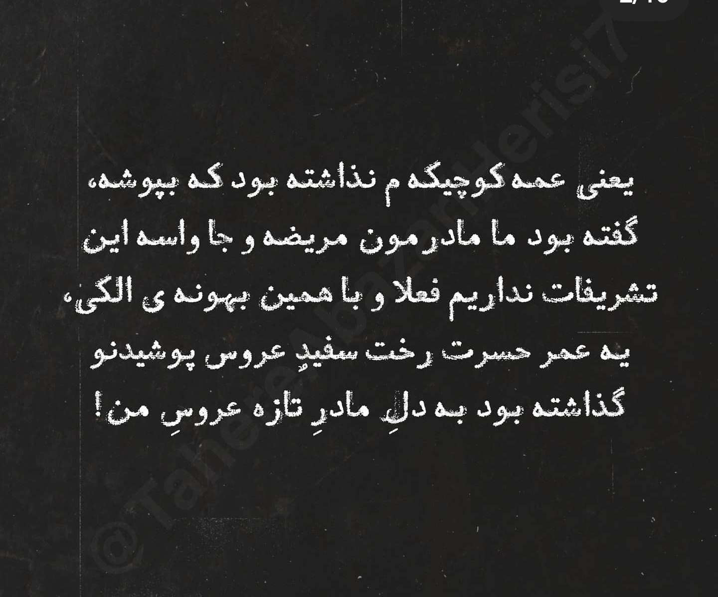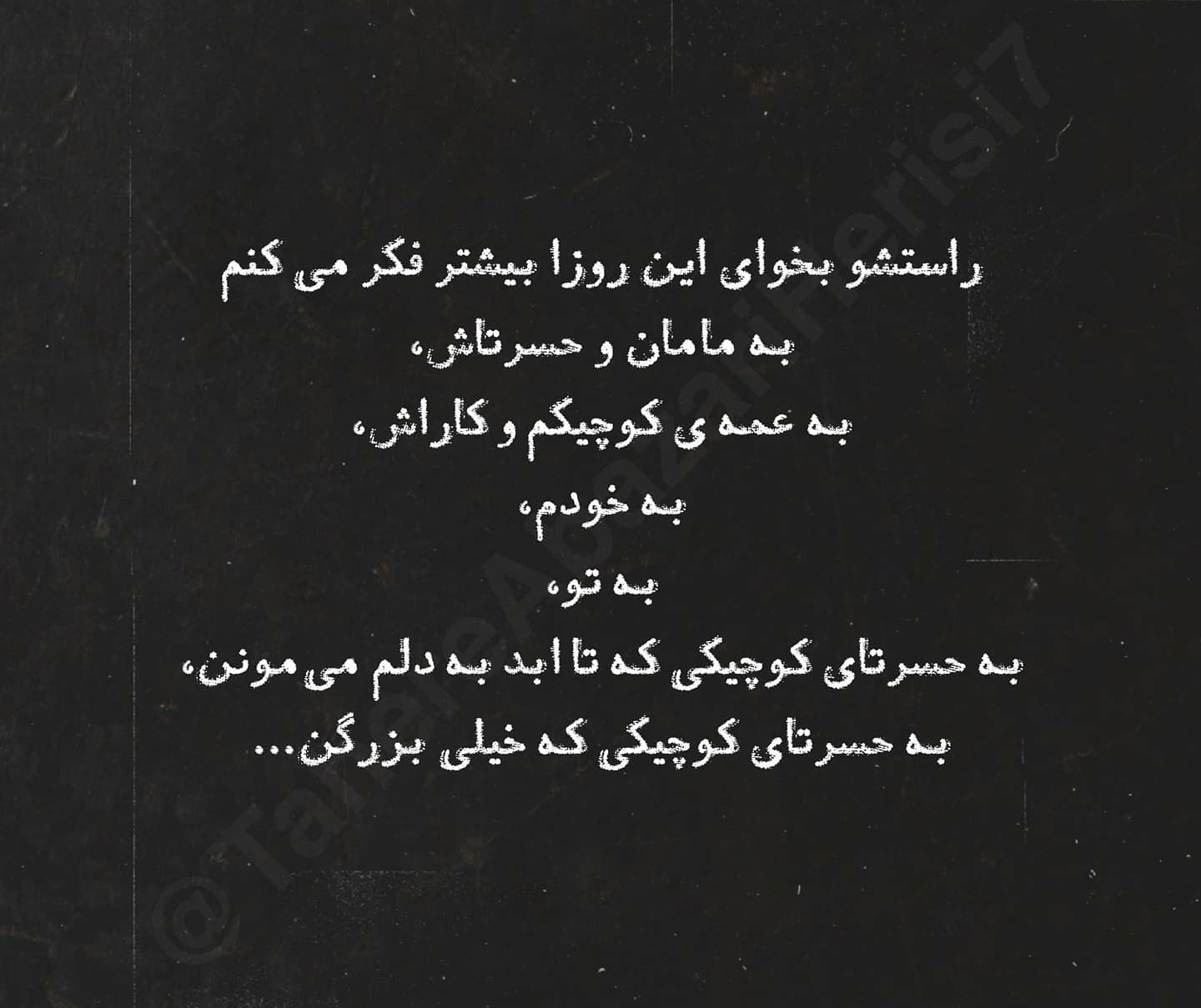 golabetoon994 مدیر استارتر عضویت: 1396/09/26 تعداد پست: 4759 عنوان حسرت +عکس 412 بازدید | 22 پست اینجا مینویسم که یادم بمونه به وقت 18 تیر ماه 1400عشق روزای دورم نمیدونم حکمت خدا چی بود که تو رو بعد سالها به من بده و دوباره بگیره فقط میدونم تو اون حسرتی هستی که تا ابد رو دلم میمونه از مسیری که رفته بودی داشت موجی از انجماد می آمد... 1400/04/18 | 12:41 0 نفر لایک کرده اند ... گزارش تاپیک نامناسب