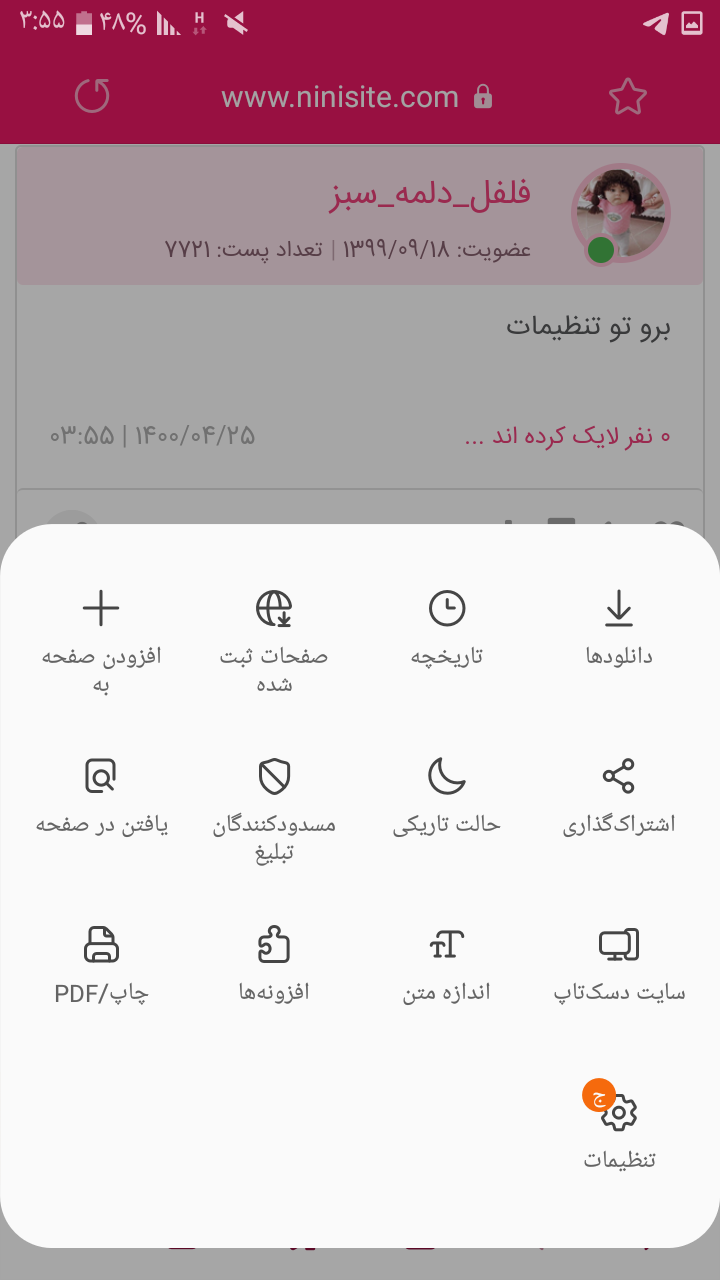 دلسا۲۷۳۷ عضویت: 1398/11/20 تعداد پست: 6182 اول تم گوشی ات از قسمت تنظیمات شب کنبعد روی سه خط پایین بزن حالت تاریکی