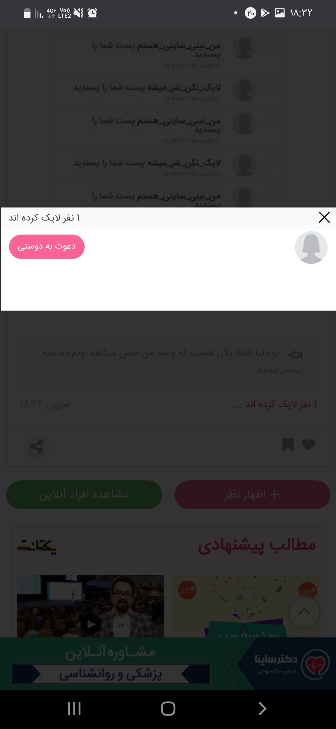 rrrrozzzz مدیر استارتر عضویت: 1398/04/11 تعداد پست: 52433 محض کنجکاوی رفتم با ایمیلم اکانت وا کردم، فقطم تو رو لایک کردم اومدم بیرون. بعدم که با همین آی دی ا ... 🤔🤔🤔عههه با ایمیل اکانت وا کنی مگه شماره هم نمیخواد؟ تو دنیا فقط یکی هست که واسه من نفس میکشه اونم دماغمه😐تموم شد و رفت