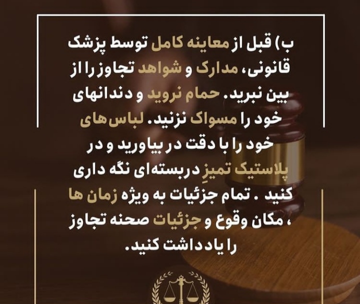 بچه ها چندتا راه کار هست برای زمانی که خدای نکرده بهتون تجاوز شد ، اینکه باید چیکار کتیم تا بتونیم تو دادگاه اثبات کنیم.... من جایی خوندم از نظر حقوقی باید چیکار کرد، لازم دونستم با شما خوبان به اشتراک بزارم ...