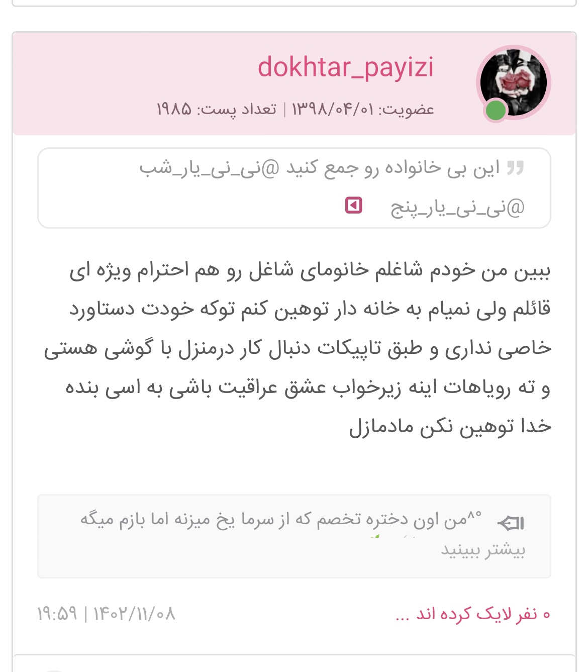 💚تنها توکلم به خدا و بعد از خدا به خودشه💛🛑دیگ قول میدم بحث نکنم 🙂چون کاربری قبلیمو بخاطر دعوا با ی کاربر بی فرهنگ ب چخ دادم و میرسیم ب جمله معروف ((جواب ابلهان خاموشیست)) از دوستای نی نی سایتیم معذرت میخوام چون مجبور بودم بگم حوصله بحث ندارم😘🧡👈🏻 (((توجه کن تویی که توهین میکنی تو ی مادر هشت پایه 🐙🦑 پدر کوسه ای🐋)))