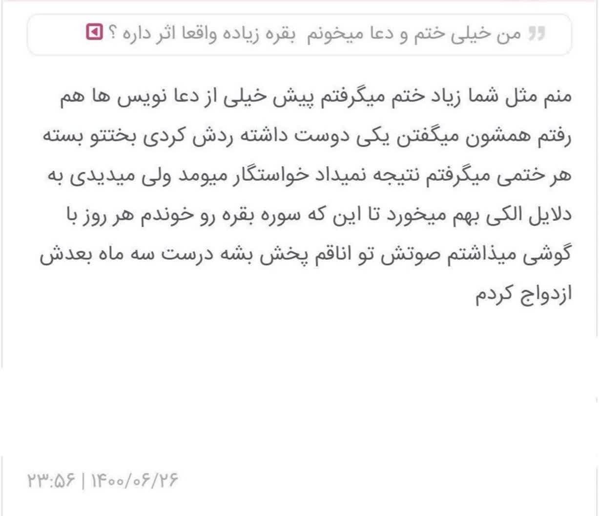 یا_ارحم_الراحمین_ عضویت: 1399/01/16 تعداد پست: 1674 نننننننننننننمراجعه نکنید به اینها که پای اجنه وارد زندگی تون باز بشه دیگه بدبخت شدید رفت خیلی رو راست گفتمکدوم انسان عاشق اهل بیت سه میلیون میگیره اونم برا این کارهاااافقط قرااااانی