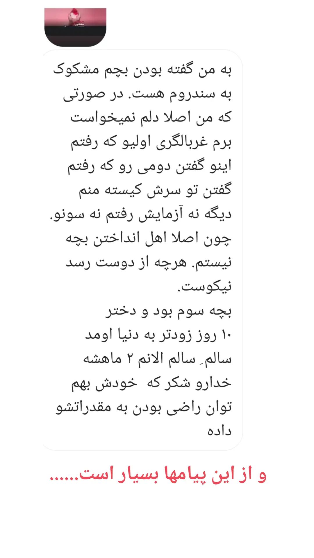 منم ریسکم بالا بود مجبور شدم سلفری بدم و خداروشکر مشکلی نداشت جنین. از الان ذهنت رو درگیر سقط نکن