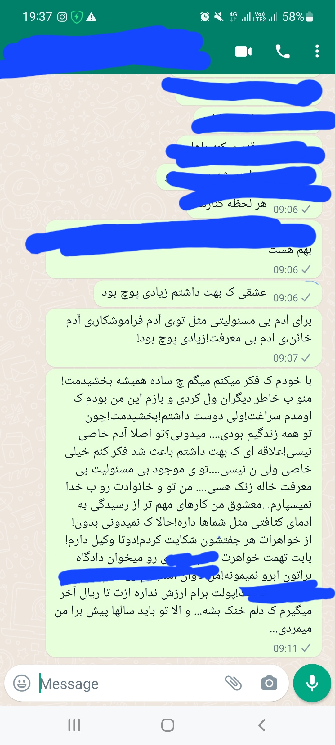 helen21 مدیر استارتر عضویت: 1396/10/24 تعداد پست: 13806 عنوان هلنم.... آخرین پیام من ب شوهرم بود+اسکرین 48805 بازدید | 174 پست این آخرین پیام من ب اون آقاس....ما تو مراحل طلاقیم دوستان لطفا نپرسید چرا چون دلیلش زیاد تو تایپیک هام هست سوخت!تمام ارزوهایم!کاخ رویاهایم!سوخت!خاکستر شد!اما از دل آن خاکستر دلم جای شکستن الماس شد! 1401/05/19 | 19:40 2 نفر لایک کرده اند ... گزارش تاپیک نامناسب