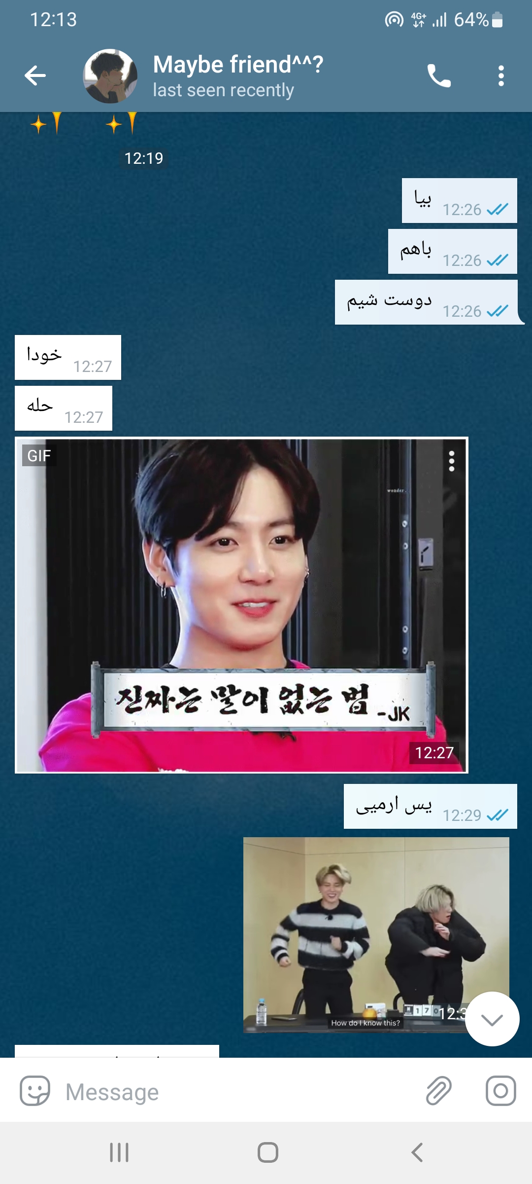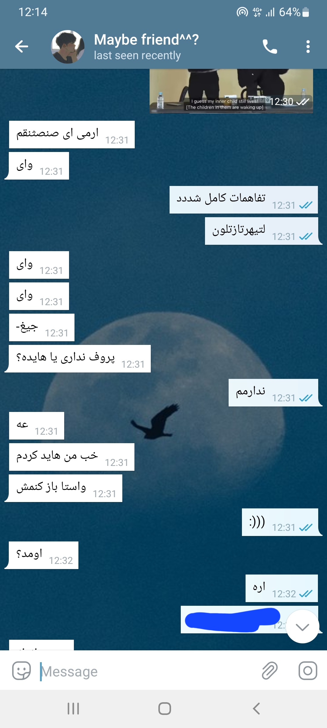 کلاسای تابستونی مدرسمون انلاینه و من نتونستم تو یه کلاسش شرکت کنم برای همین از یکی از بچه ها که نمیشناختم خواستم که برام ضبط کلاس رو بفرسته.. و خب بعدش فهمیدم که جفتمون یه دوست مشترک داریم و دوستم از من پیش اون خوب گفته و از اون پیش من.. و خلاصش اینکه حس میکنم یه گندی زدم...براتون عکس چتامونو میفرستم