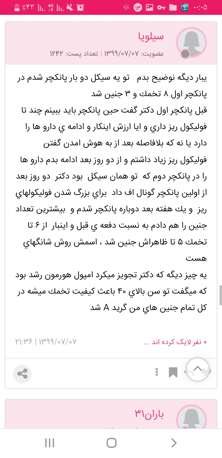 maaryam_m عضویت: 1396/10/10 تعداد پست: 15481 عزیزم آی یو آی رو پرسیده بودم ک بعدش استراحت مطلق بودین؟منم میخوام آی یو آی کنم نه عزیزم هیچ استراحتی نداشتمبعدش ی مسافرت مجبور شدم برم با پرواز رفتم و برگشتم هفتهدومش عروسی فامیل نزدیک داشتیم ک اونم رفتم و رقصیدم